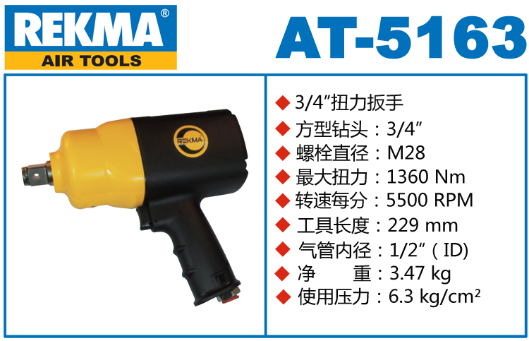 REKMA AT-5163中型氣動扳手特點(diǎn):(重力壓鑄外殼,強(qiáng)度更高不變形,提高耐用度)